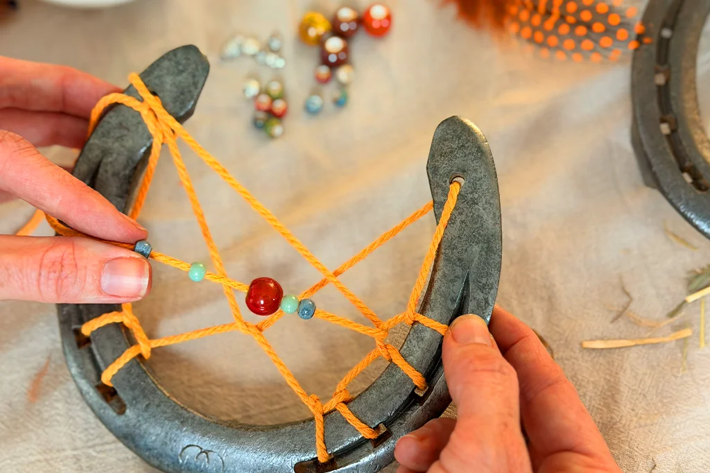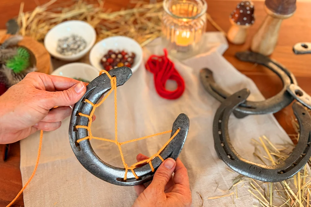 Befestige die fertigen Schnüre am unteren Rand des Hufeisens.