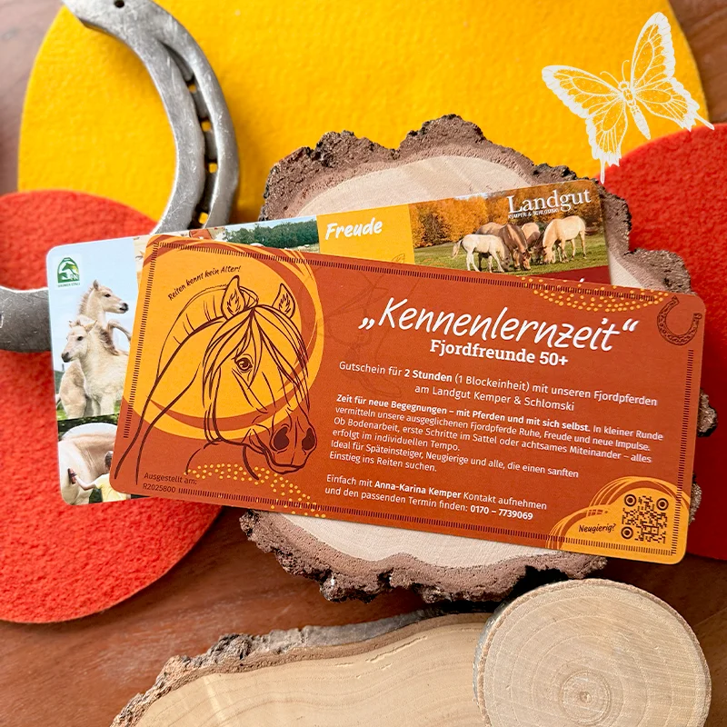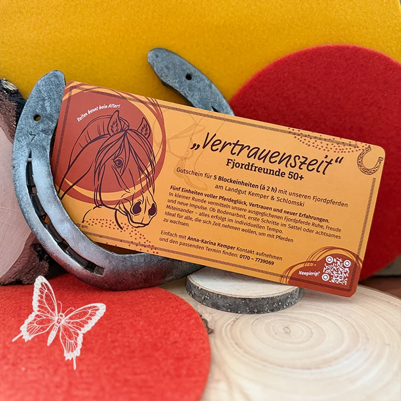 Fürs Reitenlernen ist man nie zu alt! Jetzt „Vertrauenszeit“ verschenken – 5 Blockeinheiten à 2 Stunden Fjordgestüt-Erlebnis